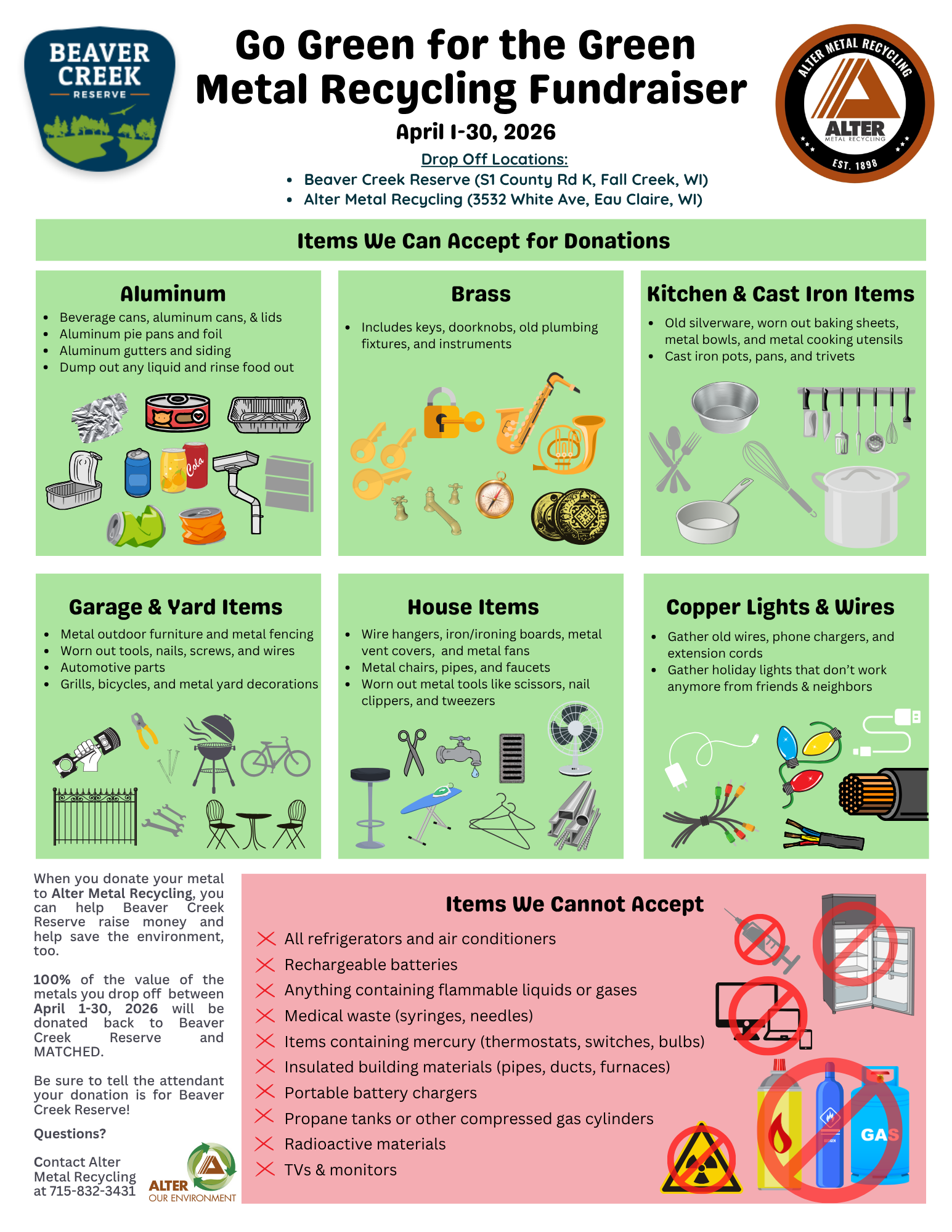 Donations can be dropped off at Beaver Creek Reserve (S1 County Rd K, Fall Creek, WI) or Alter Metal Recycling (3532 White Ave, Eau Claire, WI).